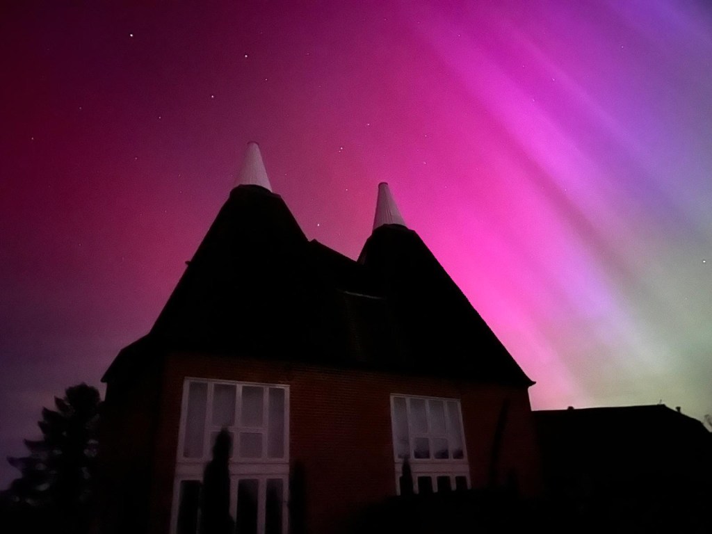 So we spent all day sorting out tech, looking out from our 21st floor into the countless 21st floor flats across a desert of concrete blocks and bugger me if it wasn’t raining . ….Just as everyone at home sent pictures of glorious sunshine and then,the one thing I’ve chased for years… the Arora Borealis surreal over the hop roofs of Marden .