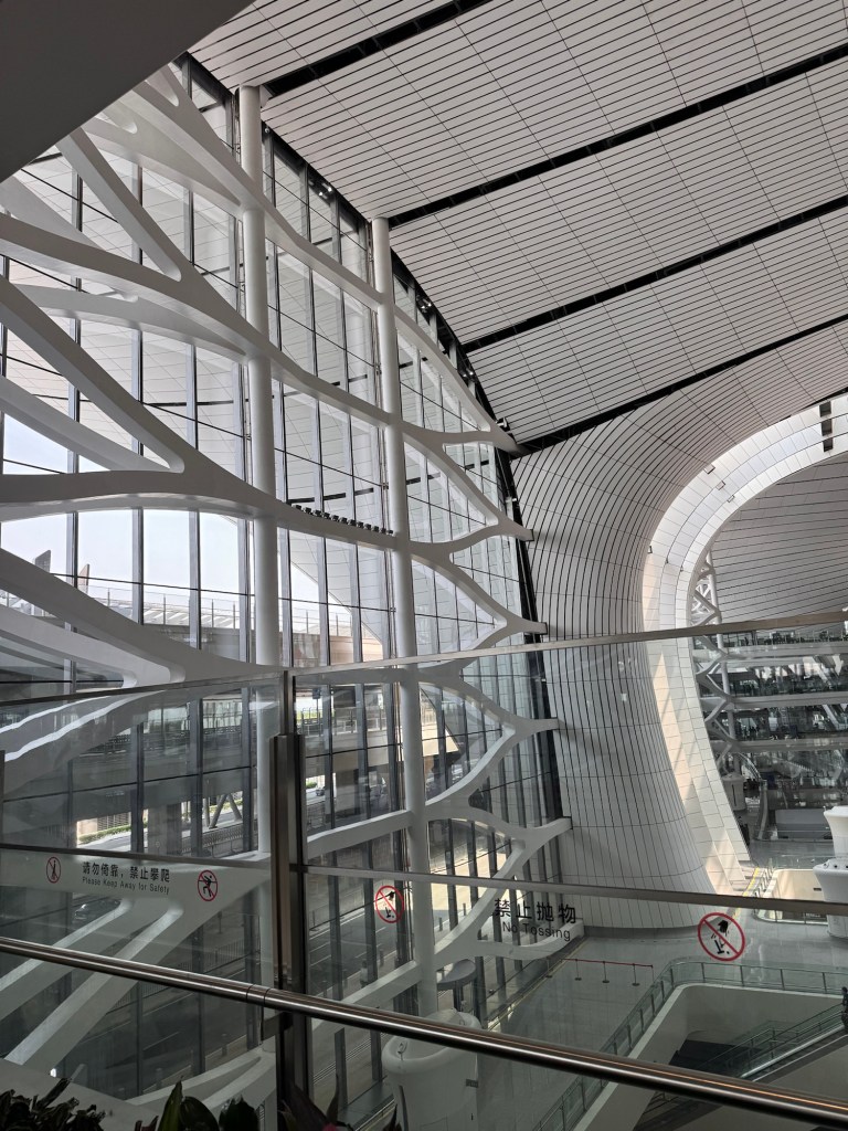 I’m used to grubby , broken Heathrow , and queuing until the man comes back from break to fix the passport machine. It was very discombobulating . No messing about in Beijing though. Our finger prints were taken within yards of disembarking . I panicked, watching P for signs of rebellion, but luckily he had spotted the police officers standing on booths, heads bobbing about like meerkats watching every move. This wasn’t a game for him to win